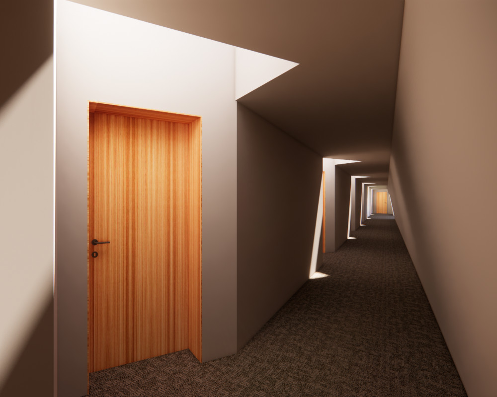 Um die Terrasse des bestehenden SPA-Bereichs im OG an den Pool im EG anzubinden wird eine Außentreppe ergänzt. Zur Verbindung des Neubaus mit dem bestehenden Hotelgebäude wird eine Brücke und ein überdachter Weg geschaffen.